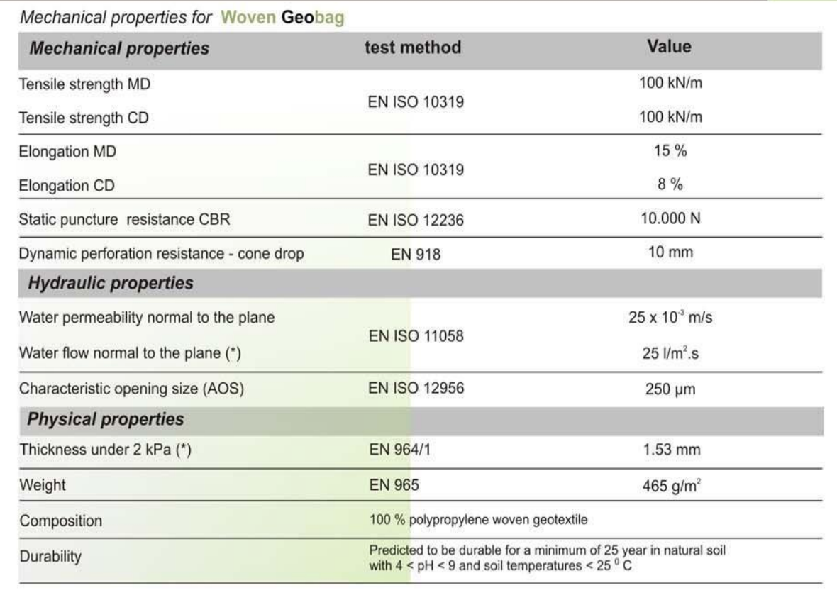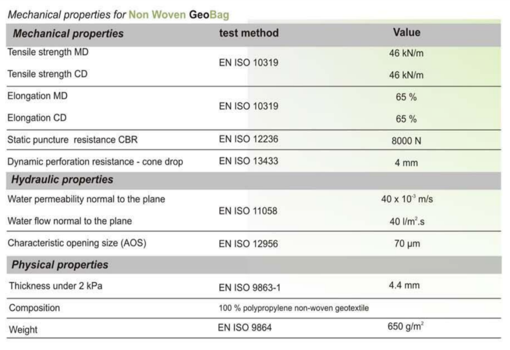 GeoBag terbuat dari bahan Polypropylene yang tahan terhadap UV. Material ini sangat ramah lingkungan. Bahkan remis, ganggang, dan lumut dapat hidup melekat pada serat GeoBag ini, menjadikan GeoBag lebih terlindungi dari sengatan matahari. Ketahanan material ini terhadap asam, basa, dan alkali membuat GeoBag dapat bertahan pada kondisi tanah dan air laut manapun.