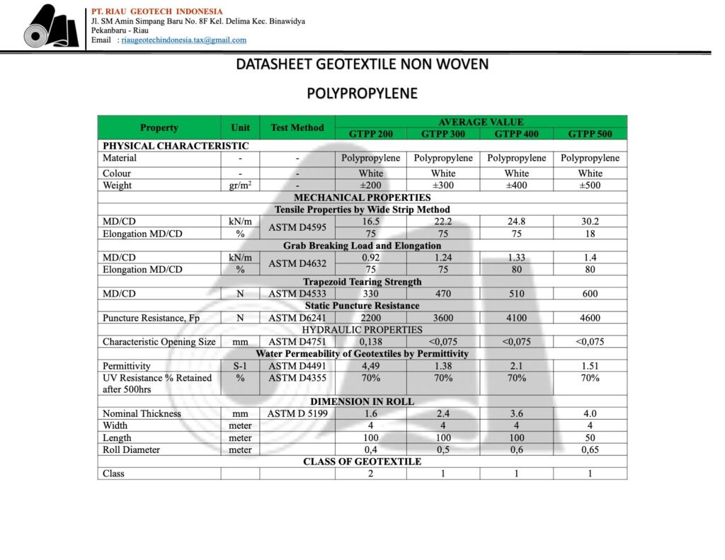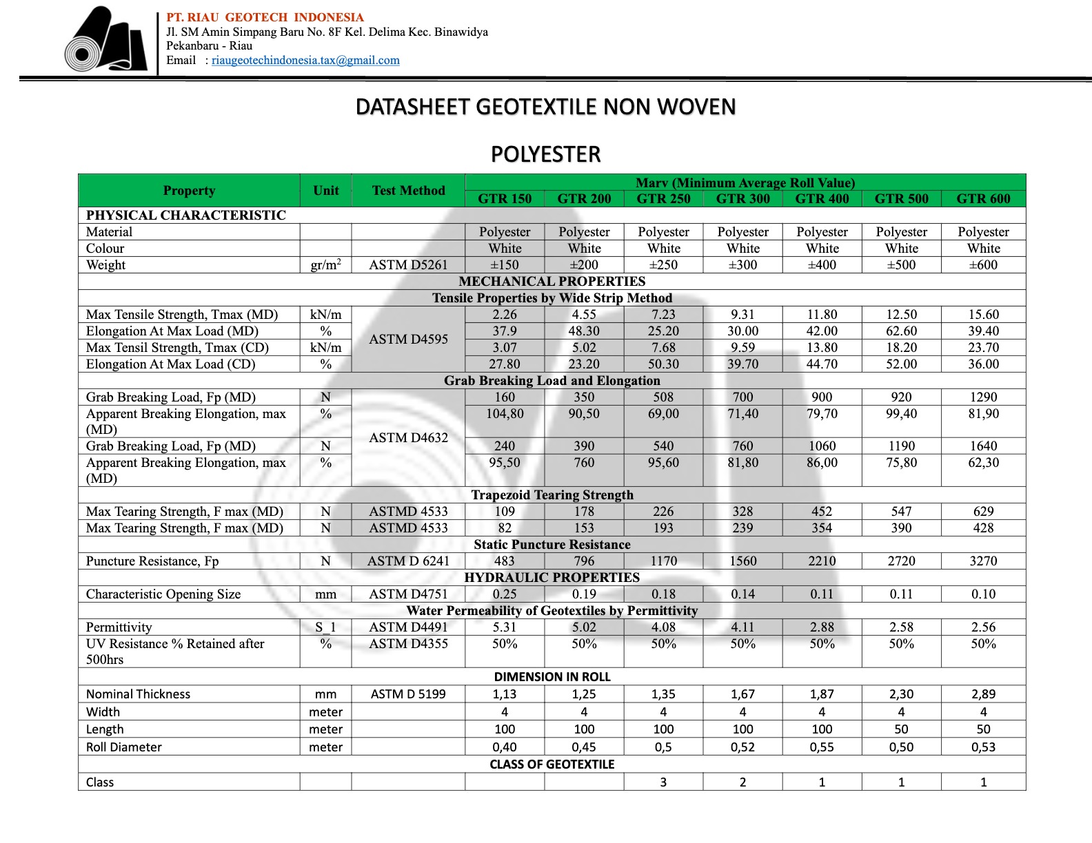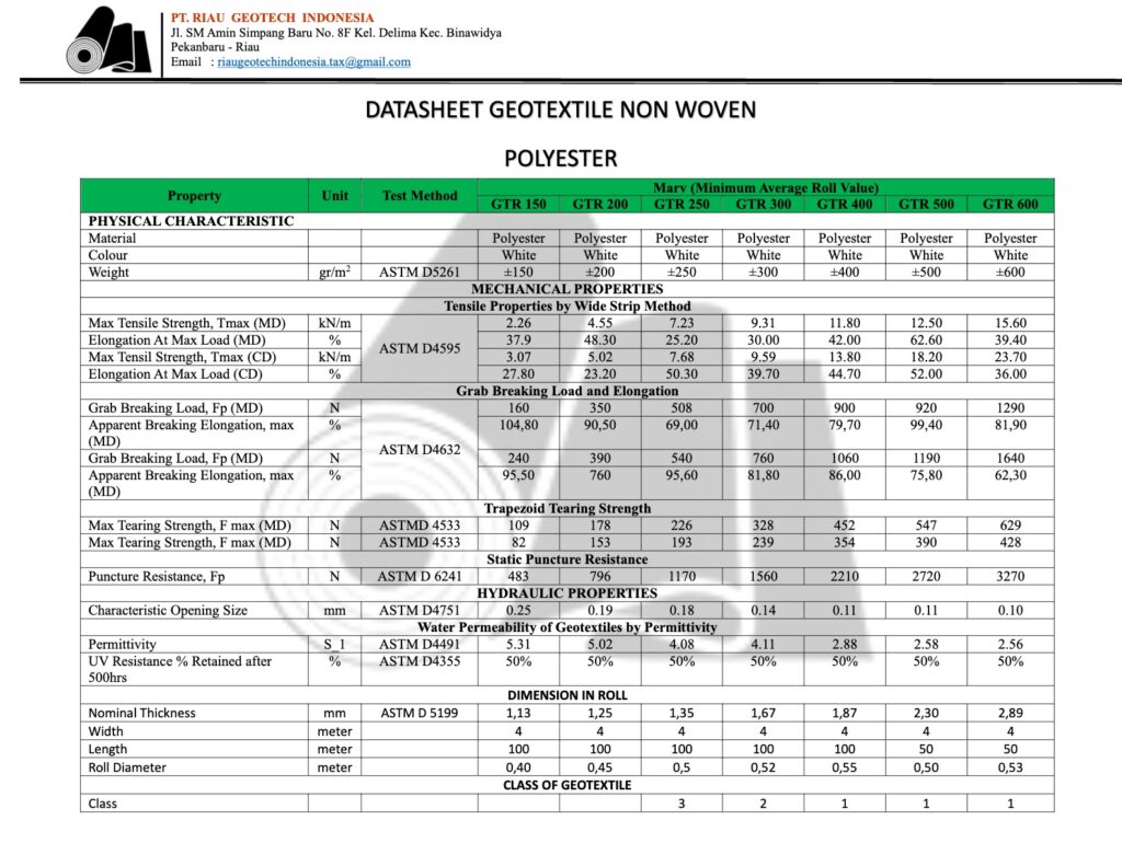 Geotextile dikenal bukan melalui tebal tipisnya namun dengan istilah Gramasi. Gramasi ditentukan dari berat produk dengan satuan gram/m2.
