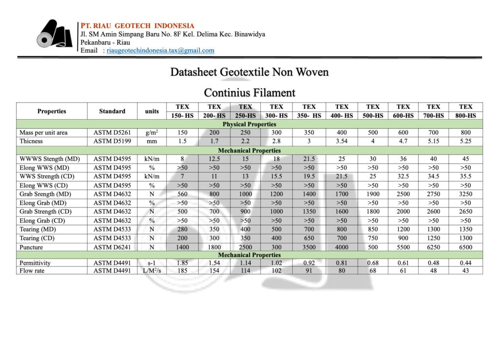 Geotextile Non Woven Continuous Filament adalah geotextile non woven yang diproses secara Continuous (berlanjut) dimana dalam proses pembuatannya serat tidak terputus sehingga menghasilkan geotextile dengan kualitas terbaik dan jauh lebih kuat dari non woven PET. Diproduksi dengan mesin teknologi terbaru dan pemilihan material berkualitas terbaik untuk menunjang pengerjaan proyek Anda.