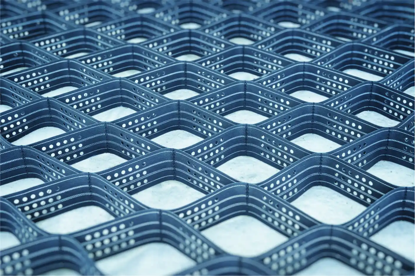 Geogrid adalah lembaran sintetis dari bahan polymer berbentuk jaring (grid) yang mempunyai kekuatan tarik yang tinggi. Bahan dasar yang digunakan adalah Hight Density Polyethylene (HDPE) merupakan bahan yang tahan pengaruh kimiawi, mikrobiologi yang umumnya terdapat didalam tanah